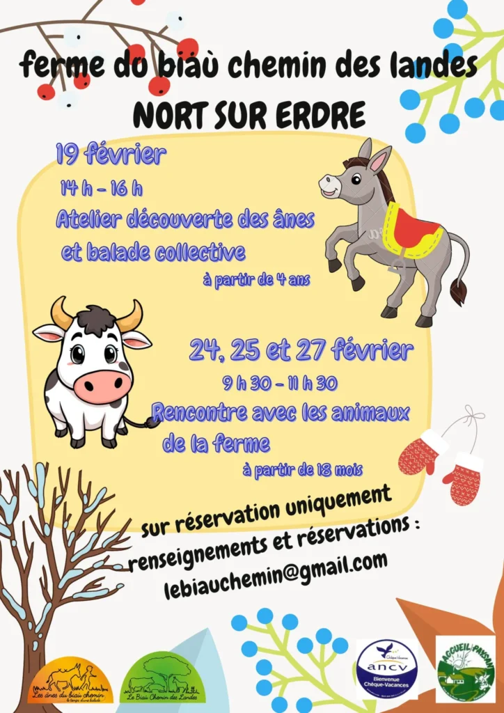 La Ferme du Biau Chemin, située chemin des Landes à Nort-sur-Erdre, propose plusieurs rendez-vous en février pour petits et grands, autour de la découverte des animaux de la ferme. Des moments privilégiés, ludiques et pédagogiques, à partager en famille. Toutes les animations se font sur réservation uniquement.